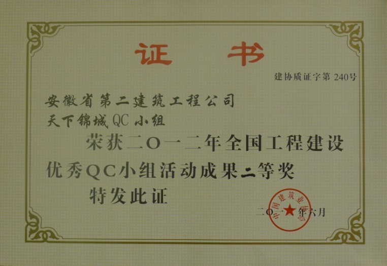 安徽二建公司喜獲“2012年度全國工程建設(shè)優(yōu)秀QC小組活動成果”二等獎和省級一等獎