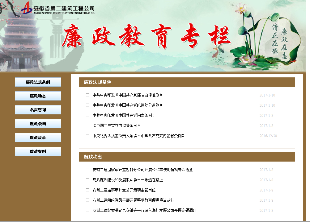 該專欄以公司網(wǎng)站為依托,設有廉政法規(guī)條例、廉政動態(tài)、名言警句、廉政漫畫、廉政故事、廉政案例六大板塊。通過廉政法規(guī)條例,轉載《中國共產(chǎn)黨廉潔自律準則》、《中國共產(chǎn)黨紀律處分條例》、《中國共產(chǎn)黨問責條例》、《安徽省預防職務犯罪條例》等一系列黨紀黨規(guī)、國家法律法規(guī)知識,并在每一次修訂后及時更新,為廣大黨員干部學習使用提供方便。運用廉政動態(tài),及時發(fā)布集團紀委和公司黨委、紀委通知要求,通報監(jiān)察審計事項與結果,做到監(jiān)督的公開化、透明化。以名言警句、廉政漫畫、廉政故事、廉政案例感染人、陶冶人,內(nèi)容直觀形象,用勤廉典型激勵人,深入剖析典型違紀案例,加強警示教育。