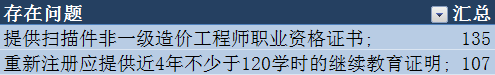 通過分析不符合條件人員的問題發(fā)現(xiàn),存在“提供掃描件非一級造價工程師職業(yè)資格證書”、“重新注冊應提供近4年不少于120學時的繼續(xù)教育證明”這兩大問題的人員較多,分別為135人和107人,占所有不符合初始注冊條件人數(shù)的49.2%。