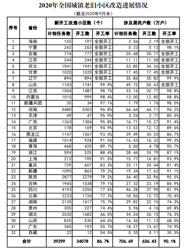 根據(jù)各地上報情況匯總統(tǒng)計,2020年1-9月份,全國新開工改造城鎮(zhèn)老舊小區(qū)3.41萬個,占年度計劃任務小區(qū)數(shù)的86.7%,較8月末提高了16個百分點;涉及居民636.43萬戶,占年度計劃任務戶數(shù)的90.1%,較8月末提高了13.8個百分點。