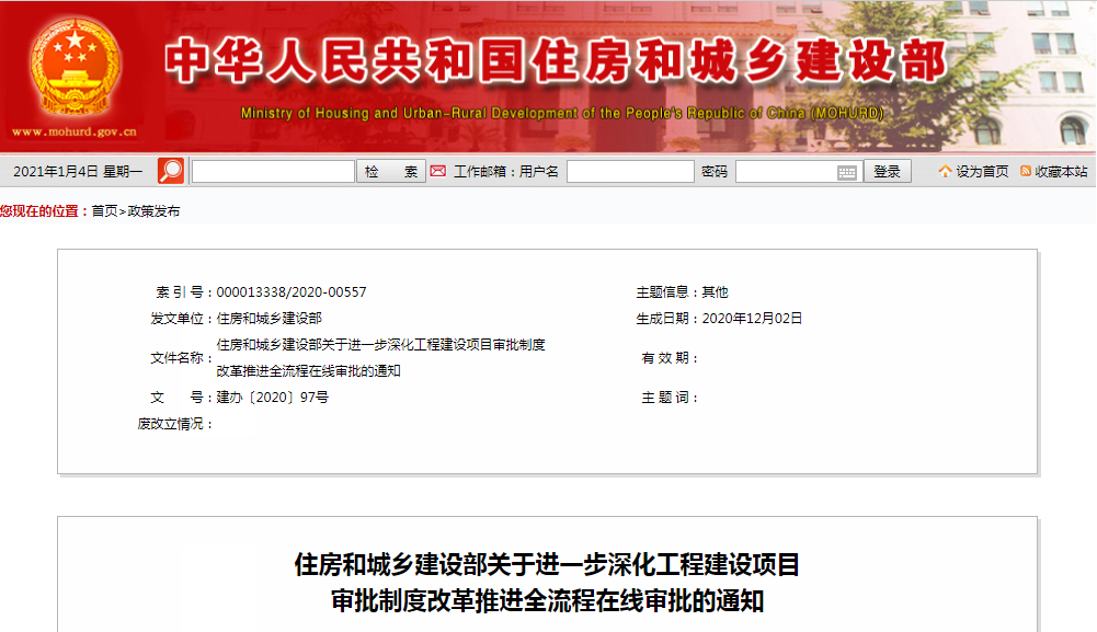 近日,住房和城鄉(xiāng)建設(shè)部印發(fā)通知,要求深化工程建設(shè)項(xiàng)目審批制度改革,加快推進(jìn)工程建設(shè)項(xiàng)目全流程在線審批,不斷提升工程建設(shè)項(xiàng)目審批效能,優(yōu)化營(yíng)商環(huán)境。