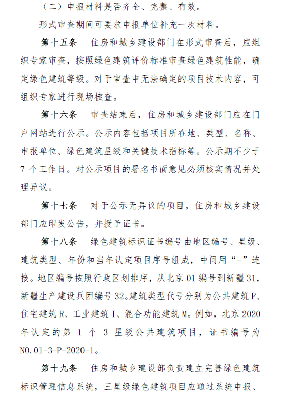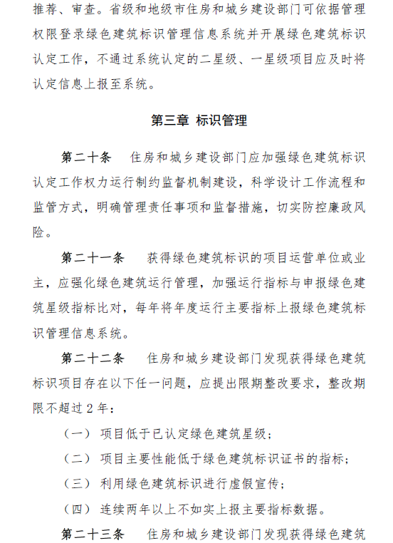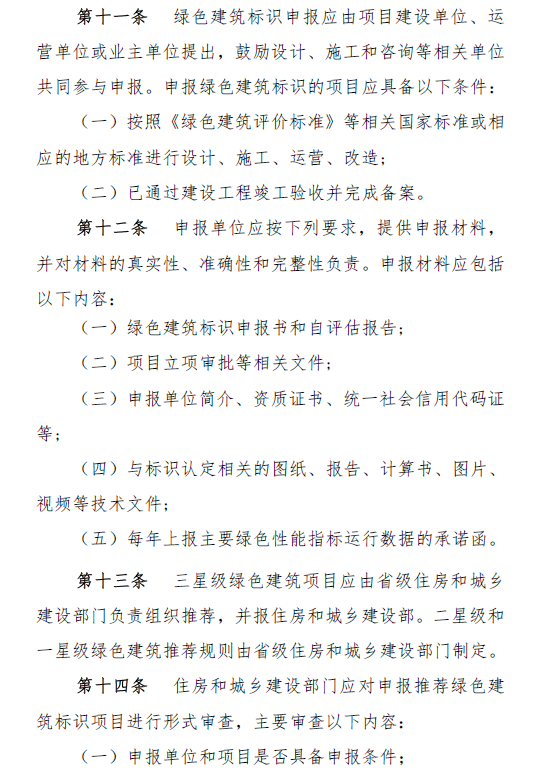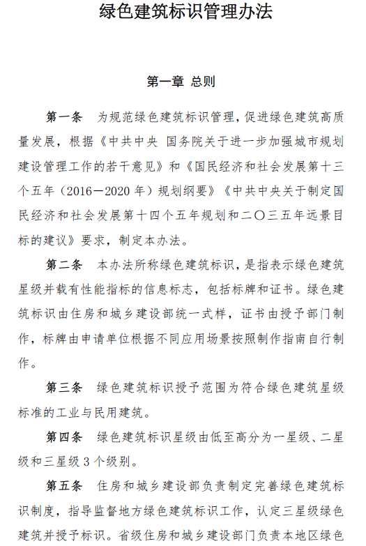 《辦法》規(guī)定,住房和城鄉(xiāng)建設(shè)部負(fù)責(zé)制定完善綠色建筑標(biāo)識制度,指導(dǎo)監(jiān)督地方綠色建筑標(biāo)識工作,認(rèn)定三星級綠色建筑并授予標(biāo)識。省級住房和城鄉(xiāng)建設(shè)部門負(fù)責(zé)本地區(qū)綠色建筑標(biāo)識工作,認(rèn)定二星級綠色建筑并授予標(biāo)識,組織地市級住房和城鄉(xiāng)建設(shè)部門開展本地區(qū)一星級綠色建筑認(rèn)定和標(biāo)識授予工作。