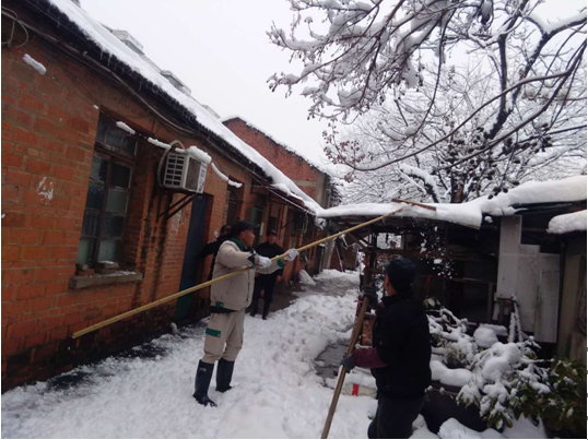 1月4日、5日,合肥地區(qū)普降暴雪,致使公司大院、分公司各生活基地多處老、舊平房100多戶遭受暴雪災(zāi)襲擊,造成樹枝斷裂壓在房頂上,危及職工住戶生命安全。路口路段出現(xiàn)大面積積雪堆積,交通堵塞,影響居民正常生活出行。面對緊急災(zāi)情,后勤綜合服務(wù)部一是立即成立了除雪保暢、維修應(yīng)急處置小分隊,合理分工,各負其責(zé)。分赴公司大院、二、四分公司生活基地,冒著雨雪搶修高壓電網(wǎng)短路、水管爆裂等災(zāi)情;二是安排人員張?zhí)┭┨鞖庾龊美吓f房屋、人身安全緊急通知的告示,防患于未然,安全為天;三是與安裝分公司協(xié)助,抽調(diào)專業(yè)電工人員幫助消除電網(wǎng)隱患,確保住戶用電安全;四是針對公司大院31棟北側(cè)一棵高13米,直徑0.7米的大樹被雪壓倒塌,造成一墻之隔的安紡2村住宅樓第二單元部分損壞和居住安全隱患,后勤及時聯(lián)系專業(yè)樹木砍伐隊伍,對樹木進行分段切割,消除了倒塌樹木對住戶造成的安全隱患,確保了住戶的人身和財產(chǎn)安全。