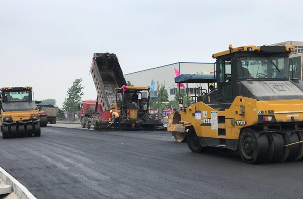 2017年5月3日上午9:58,安徽二建太和市政道路項(xiàng)目現(xiàn)場彩旗飄揚(yáng)、機(jī)器轟鳴,攤鋪機(jī)、壓路機(jī)、運(yùn)料車等各種機(jī)械設(shè)備有條不紊地進(jìn)行著瀝青路面試驗(yàn)段施工。