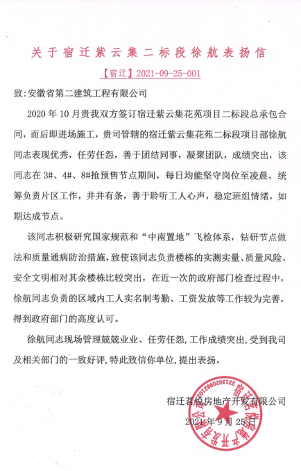近日,第三分公司宿遷中南紫云集花苑項(xiàng)目的施工員徐航收到了一封業(yè)主單位發(fā)來的表揚(yáng)信,平日大方灑脫的他在收到信后露出了靦腆的笑容,他表示:“這是自己的分內(nèi)工作,以后會繼續(xù)保持”。平日里的徐航工作責(zé)任心強(qiáng),在項(xiàng)目3#、4#、8#搶收節(jié)點(diǎn)期間,兢兢業(yè)業(yè)堅(jiān)守崗位,每日加班加點(diǎn)至凌晨,在他和所在片區(qū)工人的努力下,項(xiàng)目如期完成節(jié)點(diǎn)任務(wù)。針對項(xiàng)目現(xiàn)場工作總是親歷親為,在面對裝配式項(xiàng)目的施工難點(diǎn)、重點(diǎn)工作時(shí),通過對專業(yè)書籍的學(xué)習(xí),不斷攻堅(jiān)克難,提高能力,增強(qiáng)技能。他負(fù)責(zé)的片區(qū)在質(zhì)量風(fēng)險(xiǎn)、勞務(wù)實(shí)名制等方面工作明顯優(yōu)于其他樓棟的工作,在業(yè)主方“飛檢”、政府檢查中得到高度認(rèn)可。