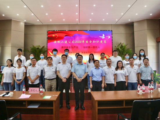 今年六月是第21個(gè)“全國(guó)安全生產(chǎn)月”,為了貫徹落實(shí)活動(dòng)主題“遵守安全生產(chǎn)法 當(dāng)好第一責(zé)任人”,用以賽促學(xué)、以活動(dòng)促宣傳的方式提高廣大職工的安全意識(shí),6月17日上午,公司工會(huì)牽頭,與安全管理部聯(lián)合舉辦了安徽二建2022年安全知識(shí)競(jìng)賽活動(dòng)。公司黨委副書記、總經(jīng)理李建成,黨委副書記、工會(huì)主席王軍出席活動(dòng),黨委委員、副總經(jīng)理葉和永,安全總監(jiān)、安全管理部主任曹建,工會(huì)副主席、女工委主任王俊出席并擔(dān)任評(píng)委。