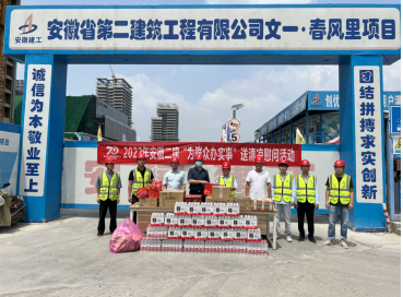 在肥東石塘鎮(zhèn)火龍社區(qū)安置點(diǎn)項(xiàng)目,葉和永為項(xiàng)目職工送上了夏季防暑藥品、飲料、花露水、毛巾等慰問(wèn)品,叮囑他們要做好疫情防控形勢(shì)下的高溫作業(yè)和高溫天氣下的勞動(dòng)保護(hù)。